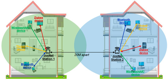It should be noted that communication can be initiated from any network protocol within JosNet brokerage, including Bluetooth, Thread, or Zigbee network. The above sequence is an example of communications initiated from Zigbee node 1 and travelling across JosNet Station 1 and Station 2 before arriving at Thread network node 2. Delivery feedbacks or ACK are not sent through JosNet but, rather, to the source node of the same network, as shown in the sequence diagram with reverse dotted arrow lines.