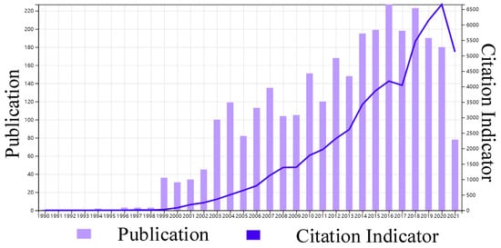 According to the Web of Science (WOS), a total of 2995 papers related to the BDRF were published between 1 January 1990 and 30 June 2021, and were cited up to 25,877 times. Figure 1 shows the number and frequency of citation of the relevant literature in English as indexed in the WOS with “BRDF” as the keyword. It shows that studies on the BRDF have increased in number in the last three decades.