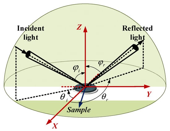 Since Nicodemus proposed a definition of the BDRF in 1965 [], various measurement devices have been designed in recent decades to measure the BRDF of different targets. The BRDF is a spatial function of four dimensions: the incident zenith angle the incident azimuth angle , the reflected zenith angle and the reflected azimuth angle (as shown in Figure 5). BRDF is defined as the ratio of scattering illuminance to incident irradiance of the light source,