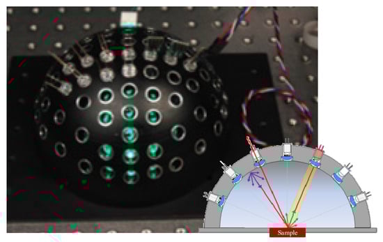 In addition to the aspheric fast measurement system, a multi-detector-based fast-measurement device was proposed in 2008 by Mosh et al. The test system was based on a spherical array, and contained only photodiodes (LEDs). The BRDF measurement device is shown in Figure 18. The system used the properties of LEDs as both light emitters and light detectors. When an LED in each array was used as the light source, the other LEDs were used as detectors. The scattered light emitted by the illumination LEDs after irradiating the sample surface was received by the other LEDs that acted as detectors in the hemispherical space array, thus enabling BRDF measurements. Owing to a lack of moving equipment in the structure, the measurement system could achieve fast measurements while remaining stable and compact, and could obtain multi-spectral BRDF measurements without being limited by the assumption of anisotropy of the sample surface. This allowed for measurements in hemispheric space without their being affected by occlusion. However, the linear array of LEDs had a low angular resolution due to limitations of the mechanical structure, and it was not possible for them to act as both a source of emission and a detector. This method, thus, cannot accurately measure backscattering [].