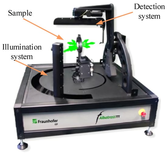 Alexander et al., of the Fraunhofer Institute for Applied Optics and Precision Engineering, developed the ALBATROSS-TT scatterometer in 2010, as shown in Figure 22. The illumination system contained a waveplate that enabled circularly polarized light, S-polarized light or P-polarized light, to shift within ±90° of the hemispheric trajectory in the horizontal plane, and a detector that could move in this trajectory to measure BRDF data on the spatial distribution of the hemisphere. All motion mechanisms were precisely positioned above 0.01°, and could be maintained in a fixed position during measurements under S- or P-polarized light. Owing to the large size of the structure, it could measure BRDFs over a wide dynamic range using ultra-polished transparent substrates on various types of rough surfaces. The system combined polarization with conventional BRDF measurements to add a layer of polarization data to the BRDF measurements [].