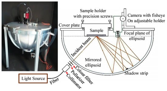Based on the properties of parabolic reflection for fast BRDF measurements, a specular reflection function analyser based on an ellipsoidal reflector was designed by Meyen et al., of the German Aerospace Design Center, in 2014, as shown in Figure 23. The source of light was fiber-coupled white light that could be made to orbit in ellipsoidal trajectory to irradiate the sample zenith at angles in the range of 6.5°~40°. A filter and polarizer were placed in front of the light source for multi-spectrum measurements in different directions of polarization. The light source was incident on the sample surface at the first focal point of the ellipsoid, light scattered from the sample surface was reflected by the ellipsoid, and entered the CCD camera through the 180° fisheye lens at the second focal point of the ellipsoid. The half-ellipsoid containing the BRDF information of the sample surface was imaged by the CCD. The system can quickly measure the spatial distribution of the BRDF on a hemispheric sample surface, but the ellipsoid in the system is a critical device in which the direction of the incident light and the reception of the scattered light were dependent. A high machining accuracy was thus required, and it was challenging to guarantee a suitable cost and accuracy of machining for such a large, closed ellipsoidal mirror [].