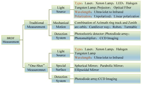 The initial structure used for BRDF measurement was simple and rough [,,,,]. It was later automated to improve the accuracy and stability of the measurements. Further advances have included the enrichment of light sources [,,,,,] (multi-spectral, and polarization), new detectors (photoelectric detection, and CCD imaging), and the emergence of devices for fast measurement [,,,,,,,]. BRDF measurement devices are developing with the aims of being able to handle large amounts of data, and having higher accuracy, higher efficiency, and greater stability. In accordance with the history of BRDF measurements, the measurement devices can be divided into those for “traditional measurement” and “fast measurement,” as shown in Figure 25.