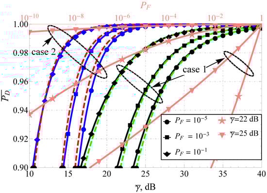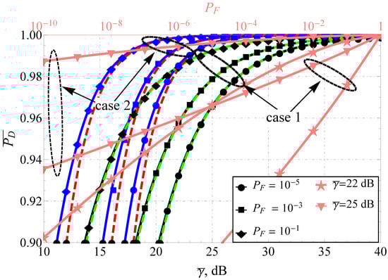 The direct comparison of APD for the Fluctuating Beckmann and the Beaulieu-Xie shadowed models (see Figure 1 and Figure 2) demonstrates the difference in the performance for the high and low false alarm rate regions (which are common, for instance, in wireless cognitive networks). The increase in the number of multipath clusters and decrease in shadowing with some power imbalance of in-phase/quadrature components () and LoS/NLoS components leads to the increase in APD. For both models, the improvement in SNR increases as predicted, but the increment rate drastically differs. To demonstrate this, both plots are supplied with a second (upper) horizontal axis that depicts the functional dependence (i.e., the average receiver operating characteristic) for two and two cases: poor propagation conditions (case 1) and improved conditions (case 2). Red and green dashed lines represent the derived approximating expressions. It can be seen that the approximations perform excellently for severe propagation conditions: high shadowing, a small number of multipath clusters and weak dominating components. Their quality degrades with the channel improvement but is still satisfactory (loses no more than 1 dB) for dB, which constrains the effective applicability of the derived approximations.