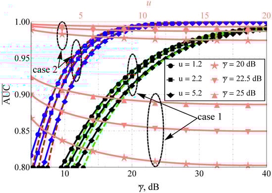 Average AUC comparison for Fluctuating Beckmann model and various u: black lines (case 1) show , , , , , blue lines (case 2) show , , , , , dashed red and green lines—proposed approximations.