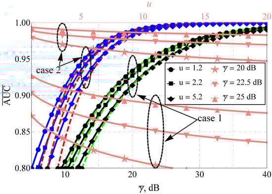The analysis of AUC for the Beaulieu-Xie shadowed model depending on its parameters (see Figure 6) demonstrated that, in the case of small SNR and balanced LoS/NLoS components, the AUC is practically insensitive to the change in (for ) irrespective of and u. Furthermore, the increase in (for ) does not introduce any sufficient gain in AUC. Thus, in the low-SNR regime, those values can be assumed as almost asymptotic (from a computational point of view). For the case of high SNR, this saturation region is extended and is highly dependent on the value of the sensing base, which introduces a pronounced impact upon the AUC. Moreover, the derived results can help to understand the possible adaptation strategies of the sensing procedure and signal processing: for instance, one can see that AUCs for the cases of and (for ) almost coincide, which means that the effects of the increase in LoS component shadowing can be balanced out by the appropriate reduction in the sensing base.