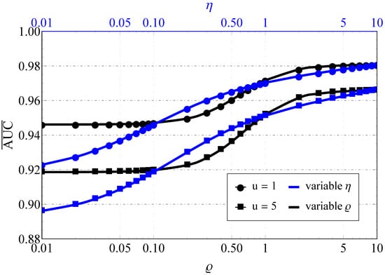 Figure 5 considers the impact of LoS (i.e., variable ρ) and NLoS (i.e., variable η) component imbalances on the Fluctuating Beckmann model and demonstrates that the increase in such an imbalance (regardless of the component type) actually improves AUC. One interesting effect that was found is the existence of AUC saturation regions (when or ), which practically means that it is insensitive to LoS in-phase/quadrature component balance fluctuations when one of them becomes highly predominant.