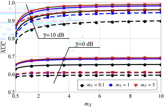 Average AUC comparison for the Beaulieu-Xie shadowed model for various and dB, dB, dB: solid lines show , dashed lines show .