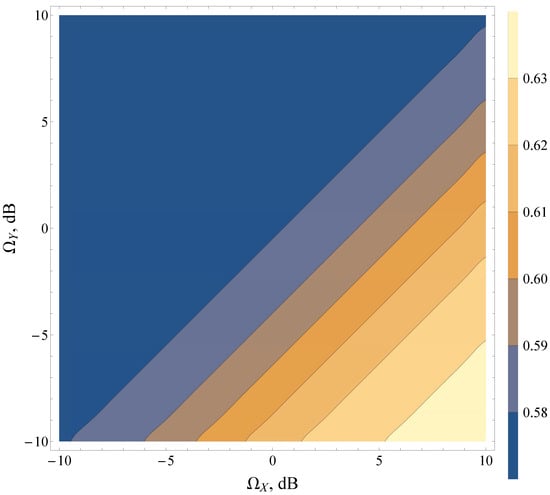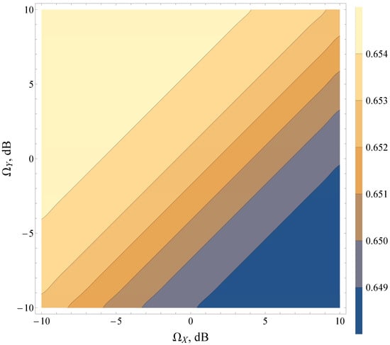 It was found that the combination of various average powers of LoS/NLoS components (i.e., and ) can lead to strictly antipodal behavior of the detection metrics. The research demonstrated that for heavy fading and shadowing conditions (both LoS and NLoS components) (see contour map in Figure 7), the increase in the total power of multipath waves (for a fixed power of dominant components) increases AUC, whereas, in the case of light fading with multiple LoS components (see contour map in Figure 8), the effects are exactly the opposite. Moreover, the lines of constant AUC (contour lines) can be approximated as , where is a constant shift in a log scale, representing LoS/NLoS component power imbalance.