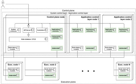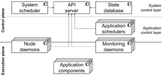 - Application control components: deployed in the corresponding layer as required by the system’s workload. Application schedulers are the only system component that belongs to this category;
