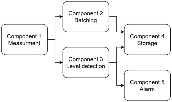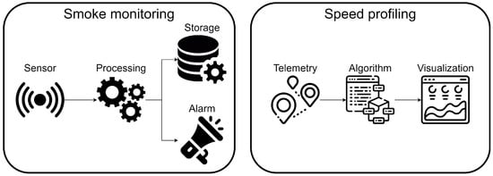 A sensor measures the smoke concentration in a wagon. The measurements are stored in a database after being processed, and are also used to raise an alarm in the driver’s dashboard if they go over a certain threshold. Despite being a simple application, it includes preprocessing, historic data storage in the Cloud and short deadlines for alarm triggering, illustrating some of the most common requirements of applications targeted towards the Cloud–Edge continuum. The application has been implemented with five components as depicted in Figure 8: