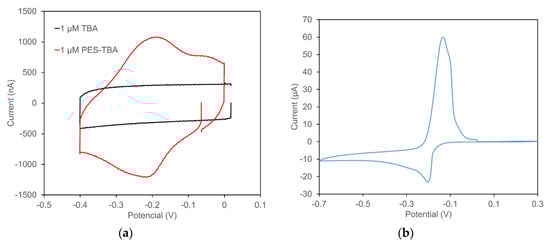 Cyclic voltammograms of thrombin binding aptamer (TBA) with or without modification by amine-reactive phenazine ethosulfate (arPES) (a), cyclic voltammogram of free methoxy-PES (mPES). (b) Cyclic voltammetry measurements were performed in 5 mL of PBS buffer (pH 7.4) in the presence of 1 µM TBA or PES modified (a) or 1 mM mPES (b), respectively. Scan rate was 600 mV/s (a), or 20 mV/s (b), respectively.