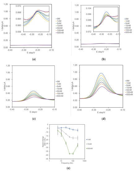 Representative square-wave voltammograms of fabricated arPES-modified thrombin aptamer immobilized electrodes at (a) 5 Hz, (b) 10 Hz, (c) 50 Hz, and (d) 100 Hz, and peak current change dependencies on frequency at each thrombin concentration (e). Square-wave voltammetry (SWV) scans were conducted as following conditions: −0.4 to −0.1 V, 25 mV amplitude. Seven concentrations of thrombin were used: 0, 1, 5, 10, 50, 100, and 500 nM. Insets in (a,b) show enlarged voltammograms.