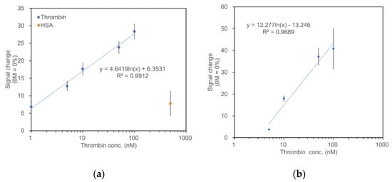 Thrombin concentration-dependent signal change (%) at PES-modified TBA immobilized electrodes (a) and at MB-modified TBA immobilized electrodes (b). Calculated as 0 M = 0%. Error bars indicate standard deviations (n = 3).