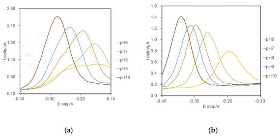 To investigate the effect of pH on the sensor response of PES modified TBA immobilized electrode, and its comparison with MB modified TBA one, SWV measurements were carried out in several pH solutions. Representative results are shown in Figure 4. The peak potential of electrodes immobilized with PES-modified TBA was shifted negatively dependent on the pH increase, from −0.15 V (pH 7) to −0.27 V (pH 10) vs. Ag/AgCl (Figure 4a). On the other hand, the peak potential of electrodes immobilized with MB-modified TBA was also shifted from −0.25 V (pH 7) to −0.33 V (pH 10) vs. Ag/AgCl (Figure 4b).
