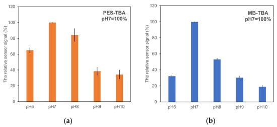 One of the inherent issues in the translation of redox probe-modified aptamers for sensing application is the impact of pH on sensor response []. Considering the potential application of E-ABs for monitoring disease, health, the environment, and process validation, methods for broadening the pH range applicable for sensing should be investigated. In this study, we investigated the pH dependency of sensors immobilized with arPES-modified TBA and compared its response to sensors immobilized with MB-modified TBA. Figure 5 summarizes these results by comparing the sensor signal observed at peak potential at pH 7; −0.15 V vs. Ag/AgCl for the electrode with PES-modified TBA, and −0.25 V vs. Ag/AgCl for the electrode with MB-modified TBA, respectively. The electrode with PES-modified TBA maintained 80% of the current at pH 8 (Figure 5a), whereas the electrode with MB-modified TBA decreased to 60% at pH 8 (Figure 5b), indicating the electrode immobilized with PES-modified TBA showed less pH sensitivity in the physiological pH compared with that of the MB-modified one. These observations suggest that arPES is a versatile redox probe, tolerant under a wide range of pH conditions, and they also indicate its feasibility when applied as a redox probe for E-ABs.