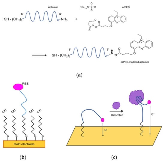 To provide an alternative redox probe for electrochemical aptamer sensor development, the novel redox probe, arPES, was investigated through its conjugation to TBA, combined with gold electrodes and analysis by SWV. TBA is a well-studied aptamer, and it was employed previously as a signal-off E-AB []. The constructed electrodes with PES-modified TBA showed a peak current decrease which was dependent on thrombin concentration, showing the potential of arPES to be used for an alternative redox probe for E-AB development.