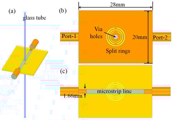 The sensor structure and some dimensions are shown in Figure 1. The substrate is 20 mm wide and 28 mm long. Port 1 and Port 2 are connected to coaxial lines. The quartz glass tube has a length of 75 mm, an outer diameter of 1.5 mm, and an inner diameter of 0.9 mm. The volume ratio between liquid sample and glass tube is 0.36. Simulations of liquid samples of different concentrations are undertaken. During the measurement, the samples are injected into the glass tube using a syringe. Each glass tube is used for only one concentration to avoid contamination.