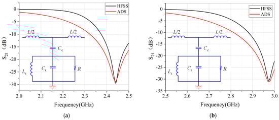 The CSRR structure in Ref. [29] is shown in Figure 2a, where the resonator uses three rectangular split rings. In the middle of the CSRR, a via hole is drilled to cater a glass tube. The main parameters of this structure are given in Table 1. The initial values of these parameters are chosen so that the outer ring is half wavelength at the resonant frequency. The final values are obtained through parameter sweep in HFSS software. Such a structure can be modelled as a hybrid LC resonator [33,34]. The corresponding values of each lumped element can be retrieved from full wave simulations, and the extracted values are given in Table 2. The response of the LC resonant circuit is evaluated using both circuit method and full wave simulation. It has to be mentioned that the central frequency is largely determined by the length of the split ring. Changing the length will modify the central frequency. To make a comparison to the design in Ref. [29], we chose the diameter of the circular ring to be the same as the side length of the rectangular ring.