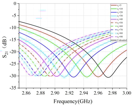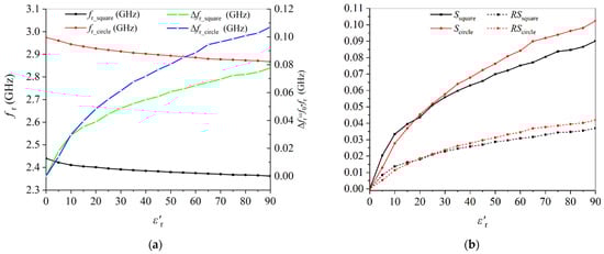 As seen in Figure 5a, the resonant frequencies for the circular and rectangular CSRR structure are 2960 MHz and 2440 MHz, respectively, which is consistent with the results of the equivalent circuit in Figure 2. The frequency shift when of the circular CSRR structure is 110 MHz, and it is 80 MHz for the rectangular CSRR structure. The frequency shift is increased by 37%. According to the definition by Juan et al. [31], the relative sensitivity (RS) in this work can be written as