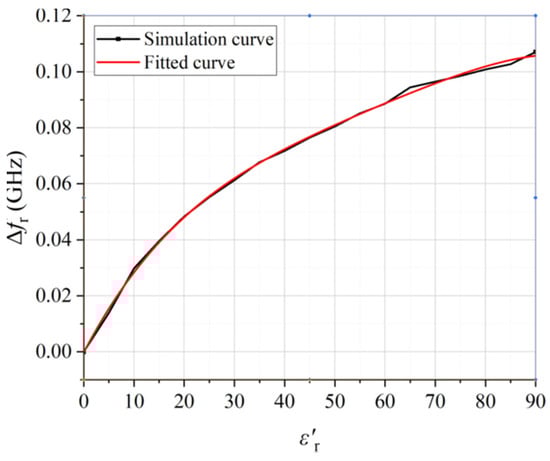 Since there are too many curves, only a portion of the simulated results are presented in Figure 8. For the unloaded case, the resonant frequency is 2.974 GHz. For other values of , the resonant frequency shifts to lower side. This reminds us that the real part of the permittivity can be retrieved by observing the frequency shift relative to the unloaded condition for the lossless sample. From the simulated results, the frequency shift versus is plotted in Figure 9, under the condition of the lossless case (). The fitted quartic equation is