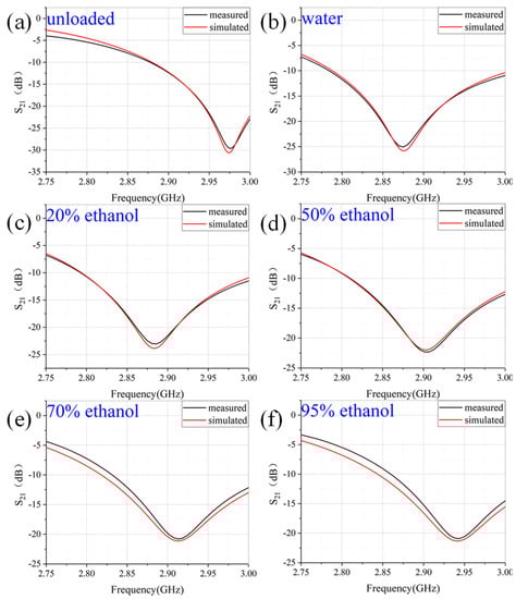 Comparison between measurement and simulation of S21 (a) unloaded; (b) 0% ethanol (water); (c) 20% ethanol; (d) 50% ethanol; (e) 70% ethanol; (f) 95% ethanol.