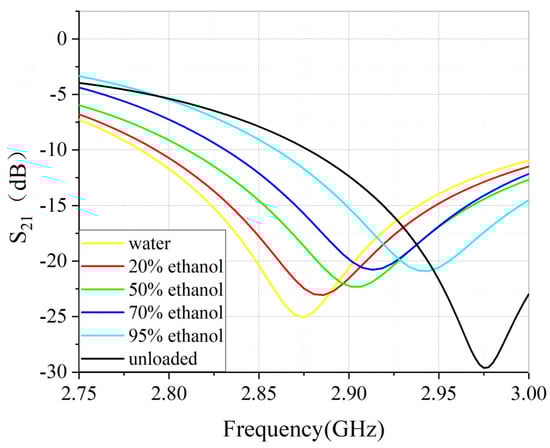 Measurement was conducted using a vector network analyzer (VNA) Ceyear AV3672D. The VNA was calibrated using a standard short-load-open-thru (SLOT) method with a 3.5 mm calibration kit. The measurement frequency range was from 2.75 GHz to 3 GHz. After calibration, the of unloaded situation was first measured. Then, the liquid samples were injected into the glass tube through syringes. In this study, the liquid sample was diluted ethanol solution with a mass concentration of 20%, 50%, 70% and 95%. These samples were injected into different glass tubes to avoid contamination. Placing the quartz glass tube filled with the measured sample to the CSRR center through the hole of the sensor and recording the for each sample. The measured data are plotted in Figure 13. From the measured data, the resonant frequency and the quality factor can be deduced. Therefore, the dielectric constant and loss tangent can be calculated by using the fitting Equations (5)–(7).