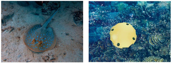 Inspired by the bottom-dwelling stingray (Figure 1), we designed the disk-shaped autonomous underwater helicopter (AUH), a new member of the AUV family, which is suitable for seafloor-resident observation and operation. Over the decades, a series of AUH prototypes have been developed for various scenarios, and in this paper, Coral-AUH is designed and implemented as the underwater mobile platform for coral observations. Coral-AUH measures 0.5 m × 0.5 m × 0.32 m, weighs 12 kg, is neutrally slightly positive-buoyant, and can swim for 60 min at a time. The designed maximum speed is 2 kn and the maximum diving depth is 200 m.