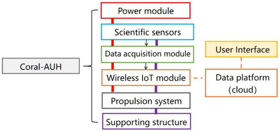 The system overview of Coral-AUH is shown in Figure 2. It mainly consists of the shell, propulsion system, power module, data acquisition module, scientific sensor group, wireless Internet of Things module, etc. The power module provides power for functional units on Coral-AUH, while the supporting structure offers a physical connection for all modules. The scientific sensor group is mounted in the frame and includes the intelligent pH (PH) electrode, intelligent conductivity (EC) electrode, intelligent dissolved oxygen (DO) electrode, intelligent turbidity electrodes, self-cleaning chlorophyll digital sensors, etc. (The selection of scientific sensor group was determined according to suggestions from professional coral observation and study team in Nanhai Institute of Chinese Academy of Sciences.) There are two sealed cabins, which isolate inner electronic devices from water. The upper sealed cabin contains a motion control module, data acquisition module and wireless Internet of Things module, and the lower sealed cabin contains power supply components such as batteries. The data acquisition control module is connected with the scientific sensor assembly through the RS485 bus, and the data acquisition control module can read the water quality data fed back by the sensor in real time and perform corresponding processing by sending control signals to the water quality sensor assembly according to the set time sequence.