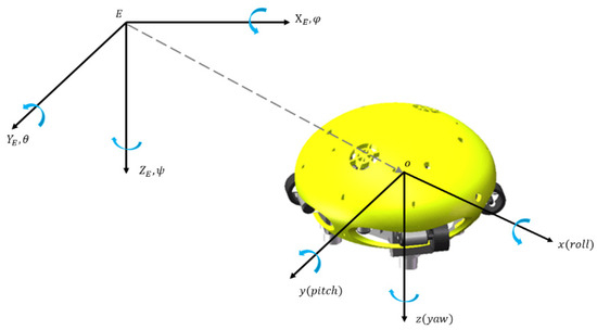 Before establishing the kinematic model, it is necessary to define the coordinate system. As shown in Figure 5, there are two coordinate frames: one is the ground coordinate frame (E-X_E Y_E Z_E), also known as the static coordinate frame, which is used as the inertial reference system, and the other is the body coordinate frame (O-xyz). In this paper, the center of buoyancy is selected as the origin O of the coordinate frame, with the body-referenced x-axis forward, y-axis to port (right) and z- axis down.