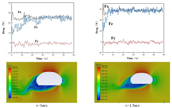 Comparing the resistance of the Coral-AUH in all directions under the conditions of the incoming flow speeds of 1 and 1.5 m/s, the resistance Fx is about 25 N at 1 m/s and about 55 N at 1.5 m/s. The resistance Fy basically fluctuates up and down around 0 N, and the Coral-AUH receives roughly the same resistance in the x-axis and z-axis, which may cause rising during the horizontal advance. It can be fine-tuned by the vertical propellers. From the velocity contour, at the speeds of 1 and 1.5 m/s, the surrounding fluid flow is similar and the streamline is good. The flow velocity of the upper fluid and the opposite flow is relatively large and then gradually decreases to both sides of the hull, and the flow velocity of the fluid behind the helicopter is relatively small.
