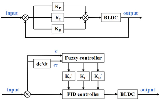 Logic diagrams of traditional PID control and fuzzy-PID control.