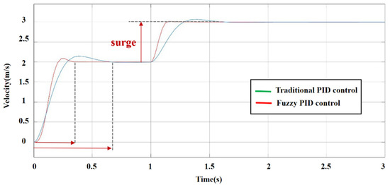 The simulation model was established in MATLAB Simulink. In the traditional PID control model, according to the optimization result, KP is set as 8, KI is set as 0.3 and KD is set as 0.8. In the fuzzy PID control model, fuzzification factors Ke = 2 and Kec = 0.1; defuzzification factors K1 = 0.8, K2 = 120 and K3 = 0.5; and initial PID parameters Kp = 0.6, Ki = 0.8 and Ki = 0.05. The comparison of response curves in traditional PID control and fuzzy PID control is shown in Figure 12. As shown in Figure 10, compared with the traditional PID controller, the fuzzy PID controller has a faster response speed, shorter time to reach the steady state and much less overshoot. When the reference input surges, the response speed of fuzzy PID control is faster in the adjustment process, and there is almost no overshoot, so the controller has a better anti-interference ability.