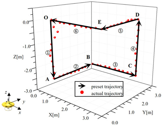 In order to verify the feasibility of the control algorithm, an experiment to test mobility was carried out in a swimming pool. A preset route was designed and input into the control system of the AUH, and the route was quite challenging as it had sharp turning and attitude adjustment. In the preset task, the AUH is supposed to follow the route through attitude adjustment and vectoring propulsion. As shown in Figure 13, the trajectory started at point O; AUH was designed to dive to Point A and then cruise to point B. After that, AUH turned 90° clockwise and cruised to point C. At point C, AUH came up to point D, and then it cruised to point E. At point E, AUH turned 90° clockwise and finally returned to point O. The whole route mainly involves variations in yaw. A comparison was made between the preset route and the actual route, and the result is shown in Figure 13. Yaw angle was also recorded in real time and compared with the preset value, as shown in Figure 14. The actual route and heading angle agree well with preset values, validating the fuzzy control algorithm.