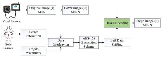 The security of secret data is a priority in cases of sensitive applications, including healthcare. Various data breaches are noted each year in the healthcare sector, demanding the development of novel mechanisms to enhance security and privacy. In the proposed scheme, we encrypted the secret data using an AES-128 encryption scheme to enhance its security. It is a symmetric cipher that involves ten rounds, pertaining to substitution and transposition of the secret information. In this work, we considered a key length of 128 bits, due to the advantage of faster encryption. After encrypting the data, Left Data Shifting (LDS) was used to embed the data into the cover image. It is a novel approach to hiding more data while observing less deterioration of the image. The data to be embedded is first converted into 3-bit (000 through 111) chunks, representing a decimal value ranging from zero through seven. The data, including the entire range of digits that were converted to 3-bit chunks, are then shifted four steps towards the negative axis of the number line; i.e., zero through seven yields negative four through three (100 through 011). Hence, the digits “0, 1, 2, 3, 4, 5, 6, and 7”, after a four-step shift towards negative axis of the number line, are substituted by “−4, −3, −2, −1, 0, 1, 2, and 3”, respectively. A higher number of bits are needed to represent the magnitude of digits zero through seven, in comparison to the magnitude of digits negative four through three. Thus, embedding data in the resultant format would yield a less deteriorated cover image when compared to conventional methods. The undesirable pixel values (out of range pixel values due to the addition of decimal values corresponding to 3-bit message chunks) are taken care of by setting different boundary conditions, so that the value of resultant pixels falls within the grayscale range of 0 to 255.