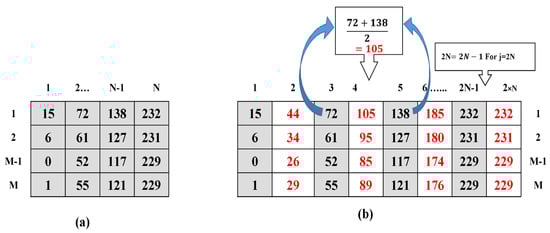 A comparison between Figure 3a,b reveals that the number of rows in the original image and the cover generated using ODNMI are the same, thus reducing the redundancy by half compared to conventional interpolation-based methods. Seed pixels (pixels of the original image) are retained, with their value, in the cover image, without any modification, and remain unaltered throughout the whole embedding process. These pixels are later used to extract the original image, thereby fulfilling the utmost requirement of RDH.