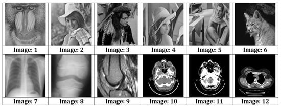 This section presents the results obtained during experimentation, and discussion of those results. Various commonly used test images, as shown in Figure 4 (Images 1–12), were used to test the proposed system. Six of the images (1 to 8) were obtained from open-source image databases (USC-SIPI, 2017, https://sipi.usc.edu/database/database.php?volume=misc, accessed on 23 January 2022); Open Access Biomedical Image Search Engine (OPENi, 2018; Image Processing Place, 2017, https://openi.nlm.nih.gov/, accessed on 23 January 2022), while four medical images (9 to 12) were obtained from a local diagnostic center (for education and research purposes). A 64 × 64 binary digital watermark, shown in Figure 5, was used for authentication purposes.
