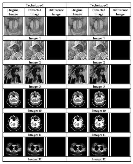 In the proposed schemes, the original image is recovered from the seed pixels after the extraction of data from the corresponding stego images. A difference between any pixel set of the two images (cover and stego), for both the schemes, results in a perfect black image, thus ensuring that the corresponding pixel difference between the two images is zero, as depicted in Figure 6. The subjective results, shown in Figure 6, show that both of the proposed schemes are perfectly reversible.