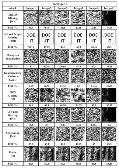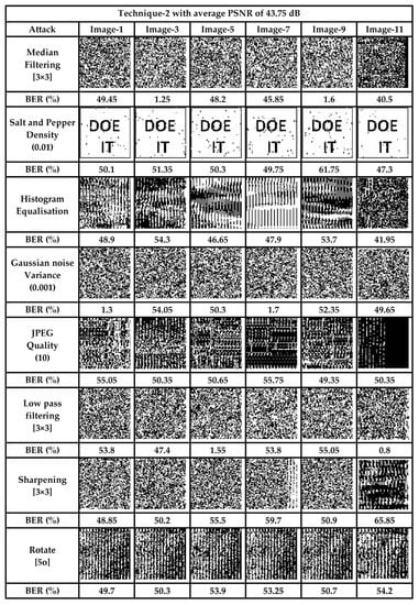 From Figure 7 and Figure 8, it is evident that any tampering with the stego-image results in extraction of the unrecognized watermark, hence validating the fact that the scheme is sensitive to various signal processing and geometrical attacks carried out on it. The average BER in the proposed scheme, to various attacks carried out on stego images, was 43.91% and 45.14% for the two techniques, respectively, which ensures that any attack on the data during transit would be successfully detected.