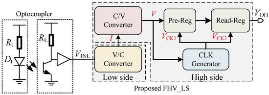 The gate drivers with FHV-LS are commonly used to control the power devices. However, the electrical noise generated by power circuits is also coupled to the driver stage by means of electricity or magnetism. To reduce the risk of false trigger, optocouplers are applied to achieve electrical isolation between the control signals and the high-voltage signals. Then, the optocoupler transmits the control signal to the input of the level-shifting circuit as shown in Figure 2. The proposed FHV_LS is composed of high-side circuit and low-side circuit. The high-side circuit consists of C/V converter, registers (pre-Reg, read-Reg), and CLK generator. The V/C converter on the low side converts the input voltage into the current signal . The C/V converter on the high side then transforms the current into the voltage which is the input to the CLK generator and pre-Reg. The CLK generator generates the control signals and to enable the pre-Reg and read-Reg in the latch or transfer mode. If pre-Reg operates in the transfer mode, the output of the C/V converter is stored in pre-Reg, while read-Reg works in the latch mode to hold . Conversely, pre-Reg operates in latch mode, and read-Reg is in transfer mode to transmit the output of pre-Reg to . Based on the mode switching for registers, the "next" state of is loaded in pre-Reg in the steady state. During the switching of , the input state restored in pre-Reg is transmitted to the output under the control of /. In other words, the present state of is transmitted to . Therefore, the propagation delay of FHV-LS is determined by the delay from to .