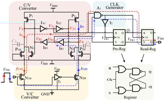 The implementation of the proposed FHV-LS is depicted in Figure 3. It involves two power rails, namely the low-side power rail (-GND) and the high-side power rail (-). The V/C converter on the low side is composed of HV-NMOS (-) and inverter . The logic states of and are flipped by . The C/V converter on the high side consists of transistors (-, -), inverters -, -), and HV-PMOS (-). The CLK generator is composed of the Nand gate and inverter . The pre-Reg/read-Reg registers controlled by / are clock-controlled RS flip-flops. The signal transmission paths of proposed FHV-LS from to are highlighted with red and blue dashed lines during witches. To make the formula clear, "0/1" represent logic low/high for the high-side and low-side logic signals.