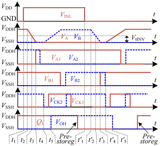 The operating process of the proposed FHV_LS is depicted as shown in Figure 4. We assume that = 0 is the initial input state. In this state, , N, , and are turned off. , N, , and are turned on and operate in the linear region. So, = = = 1, = = = 0. The outputs of the CLK generator are = 0 and = 1. According to the register, pre-Reg operates in the transfer mode, while read-Reg is in the latch mode. The output of pre-Reg is determined by the logic of and , so = 1. It indicates that the next state of is loaded in pre-Reg in the steady state. For the latch mode of read-Reg, it is worth mentioning that the output of read-Reg is an uncertain value during power-up. So, the start-up circuit is required to force the output state of read-Reg to be = 0. The start-up circuits will be discussed in Section 4.