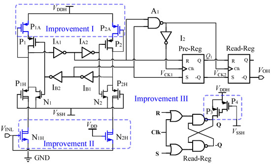 - A novel level-shifting circuit structure with pre-storage technology is proposed to achieve low propagation delay. Then, the design approach and implementation of the proposed FHV-LS are presented.