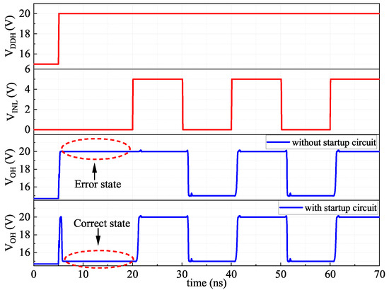 The output state of proposed FHV-LS with and without the start-up circuit during power-up.