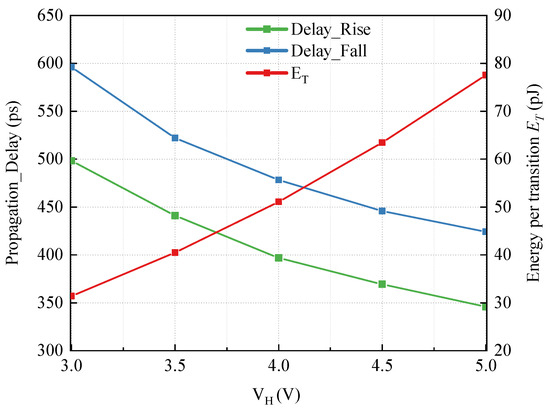 The average propagation delay and power consumption versus supply voltage are exhibited in Figure 10. As varies from 3 V to 5 V, the rising propagation delay changes from 498 ps to 346 ps and the falling propagation delay changes from 596 ps to 424 ps, while the changes from 31.5 pJ to 77.5 pJ. From Equations (17) and (18), it is known that the propagation delays consist of the delays of logic gates and the fall time of , which are nonlinear with respect to the supply voltage, taking Equations (3) and (4) into condition. Therefore, there is a nonlinear relationship between the propagation delay and supply voltage. On the other hand, the delay of logic gates, as can be seen from Equations (17) and (18), is the major component in the propagation delay. Based on the principle of integrated circuit, the propagation delay of logic gates decreases as the supply voltage increases. As a result, it can be found from Figure 10 that the propagation delays of proposed FHV-LS are negatively correlated with the supply voltage. To achieve low propagation delay, higher supply voltage is required, but power consumption is increased as well. In addition, the rising propagation delay is lower than falling propagation delay since the body effect exists in the input device . With Improvement-II, the deviation between rising and falling propagation is lower than 17%.