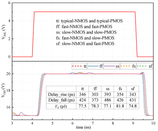 The propagation delay and at different process corners are simulated in Figure 11. The rising and falling propagation delay at typical process corner are 346 ps and 424 ps, respectively. Based on the typical process corner, the drift value on propagation delay at ss and ff corners is lower than 15%, and the drift value on propagation delay at fs and sf process corners is lower than 2.5%. As can be seen from Figure 11, the maximum power consumption of appears at the fs corner. At this corner, the logic threshold of is lower than that of other corners. As a result, the dynamic power consumption of at the fs corner will increase. Conversely, the dynamic power consumption of at the sf corner will decrease for the higher logic threshold, since the logic thresholds at tt/ff/ss corners are almost unchanged, and they also have similar energy per transition ().