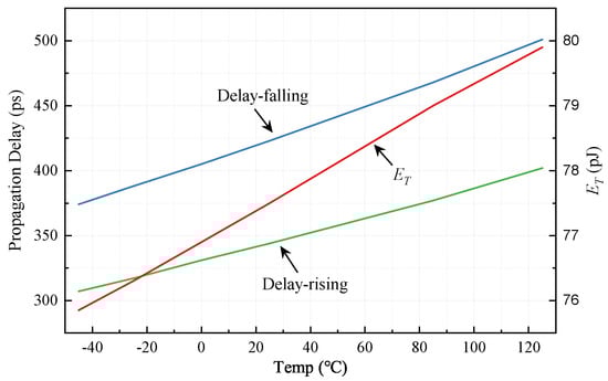 The simulation of the propagation delay and at different temperature are shown in Figure 12. As temperature varies from −40 C to 125 C, the rising and falling propagation delays increase from 307 ps to 402 ps and from 374 ps to 501 ps, respectively. Therefore, the temperature coefficients of the rising and falling propagation delay are 0.75 ps/C and 0.56 ps/C, respectively. As can be seen from the figure, is positively correlated with the temperature as well. The temperature coefficient of is 0.024 pJ/C.