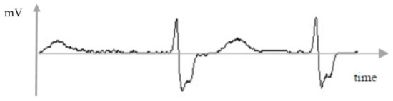 ECG-signal data came from Korea University Anam Hospital in Seoul, Korea, with 28,308 unique patients. Other information including age, gender and medical history was excluded from this dataset because of hospital rules and regulations. This retrospective study was approved by the Institutional Review Board of Korea University Anam Hospital on 12 February 2018 (2018AN0037). Informed consent was waived by the IRB given that data were de-identified. Lead-II ECG-signal data (taken from 12-lead ECG image traces) were measured for 10 s at the frequency of 200 Hz. Among the 28,308 patients, 80%, 10% and 10% were used as training, validation and test sets, respectively. Training/validation was performed in a personal computer whereas testing was completed on an embedded wearable device. Among the 28,308 patients, 15,412 were diagnosed as normal (Categories 1–4 in Table 1) and 12,896 as arrhythmia (Categories 5–7 in the table). A normal ECG wave has five elements: P (atrial contraction); Q (downward deflection immediately before ventricular contraction); R (the peak of ventricular contraction); S (downward deflection immediately after ventricular contraction); and T (ventricular recovery). On the other hand, an atrial fibrillation wave registers irregularity, e.g., a P element is missing and a QRS element is irregular with no regular pattern. An example of the preprocessed ECG signal is given in Figure 1.