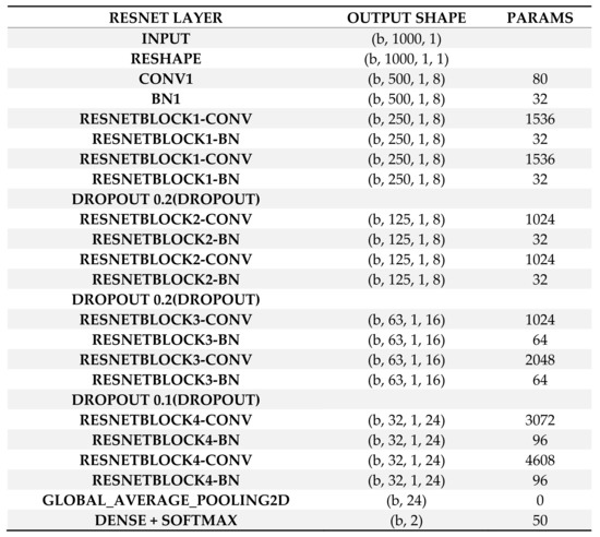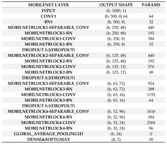 For the diagnosis of arrhythmia in an embedded wearable device, this study applied and compared two neural network models, Resnet [21] and Mobilenet [22], with model compression in TensorFlow Lite [26]. The models used in this study are shown in Figure 2 and Figure 3. A neural network is a network of “neurons”, i.e., information units combined through weights. Usually, the neural network has one input layer, one, two or three intermediate layers and one output layer. Neurons in a previous layer connect with “weights” in the next layer and these weights represent the strengths of connections between neurons in a previous layer and their next-layer counterparts. This process starts from the input layer, continues through intermediate layers and ends in the output layer (feedforward operation). Then, learning happens: These weights are accommodated based on how much they contributed to the loss, a difference between the actual and predicted final outputs. This process starts from the output layer, continues through intermediate layers and ends in the input layer (backpropagation operation). The two operations are replicated until a certain expectation is met regarding the accurate diagnosis of the dependent variable. In other words, the performance of the neural network improves as long as its learning continues. Finally, a deep neural network is a neural network with a large number of intermediate layers, e.g., 5, 10 or even 1000. The deep neural network is called “deep learning” given that learning “deepens” through numerous intermediate layers [11,12].