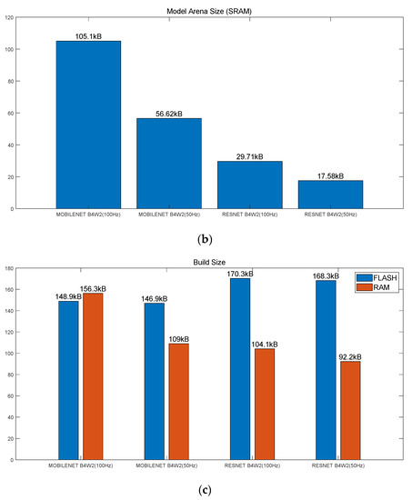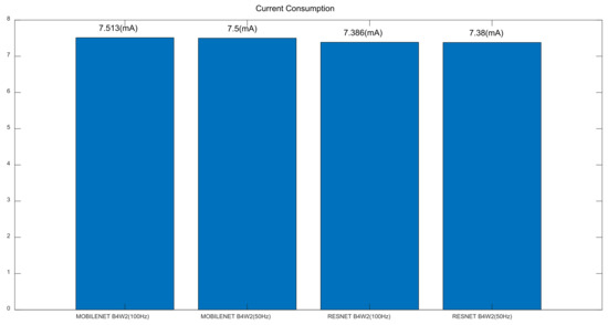 Secondly, Resnet and Mobilenet were compared in terms of model size (FLASH), model arena size (SRAM) and model build size in Figure 5. The former model took more flash memory in Figure 5c: Resnet-50 Hz (168.3 KB) vs. Mobilenet-50 Hz (146.9 KB), Resnet-100 Hz (170.3 KB) vs. Mobilenet-100 Hz (148.9 KB). However, the opposite was true for random access memory in Figure 5c: Resnet-50 Hz (92.2 KB) vs. Mobilenet-50 Hz (109.0 KB), Resnet-100 Hz (104.1 KB) vs. Mobilenet-100 Hz (156.3 KB) (Figure 5c). Thirdly, it was shown in Figure 6 that Resnet took longer inference time than Mobilenet: Resnet-50 Hz (298.23 ms) vs. Mobilenet-50 Hz (149.72 ms), Resnet-100 Hz (603.62 ms) vs. Mobilenet-100 Hz (298.95 ms) (Figure 6). Fourthly, current consumption was reported to be similar among the four models, i.e., Resnet-50 Hz (7.4 mA), Mobilenet-50 Hz (7.5 mA), Resnet-100 Hz (7.4 mA), Mobilenet-100 Hz (7.5 mA) (Figure 7). Overall, Mobilenet would be a more efficient model than Resnet to classify arrhythmia in an embedded wearable device.